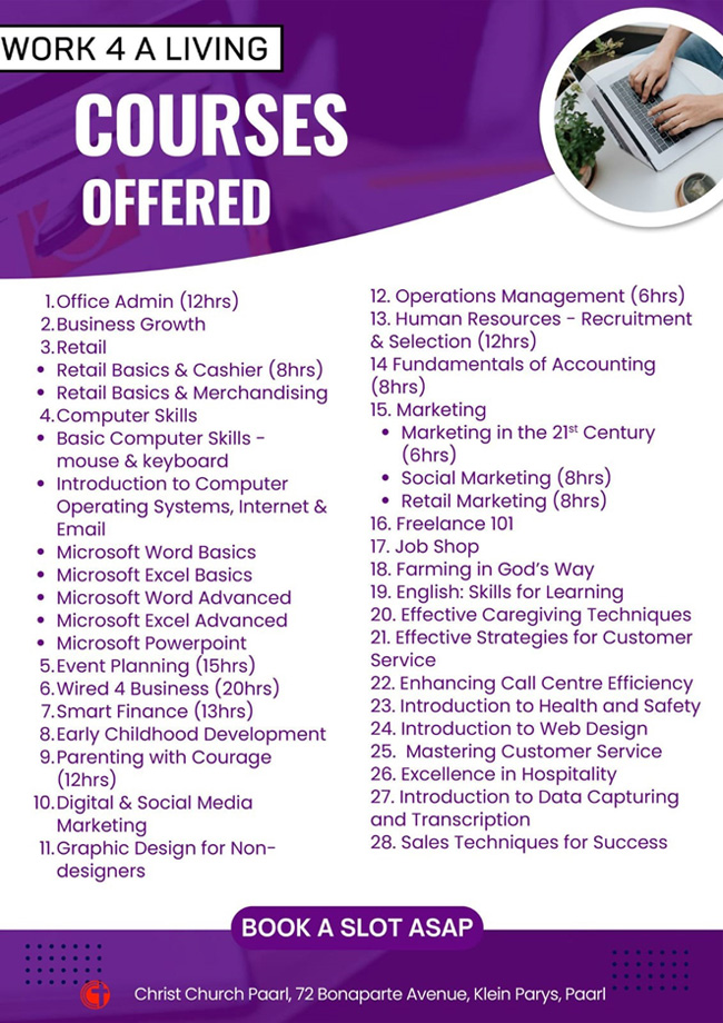 We are a non-profit Company whose main priority is to help unemployed people in the Drakenstein area to get employment. We do this by preparing our students for employment and identifying employers who value the qualities in Work 4 a Living students.