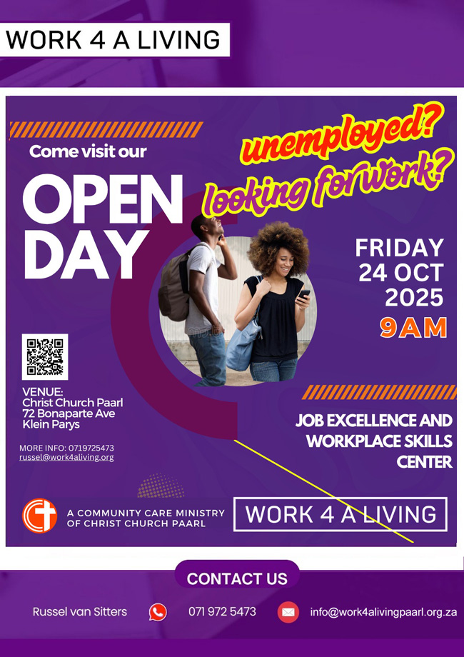 Work for a Living recently attended the abovementioned event at the Paarl Townhall on 9 October 2025. It was arranged by the Yeboneers. This is a group of young people who finished school and were in possession of Matric Qualification.